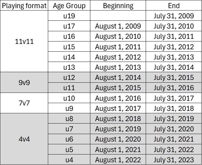 A finalized revision of this decision was announced to move the current “calendar year” (January 1 - December 31) age group formation to the “school year” (August 1 - July 31) timeframe. This new age group setting will be implemented for the 2026-27 season/registration year, beginning with the tryout period in June 2026. Please note that “school year”